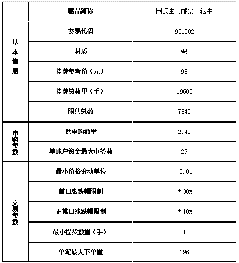 經(jīng)景德鎮(zhèn)陶瓷交易所有限公司(以下稱本交易所)發(fā)行會(huì)員申請(qǐng),本交易所專家委員會(huì)、新藏品掛牌審核小組評(píng)估審核通過(guò),對(duì)已經(jīng)完成托管入庫(kù)的藏品《國(guó)瓷生肖郵票一輪牛》準(zhǔn)予在本交易所線上實(shí)物交易系統(tǒng)正式掛牌交易,具體事項(xiàng)公告如下: